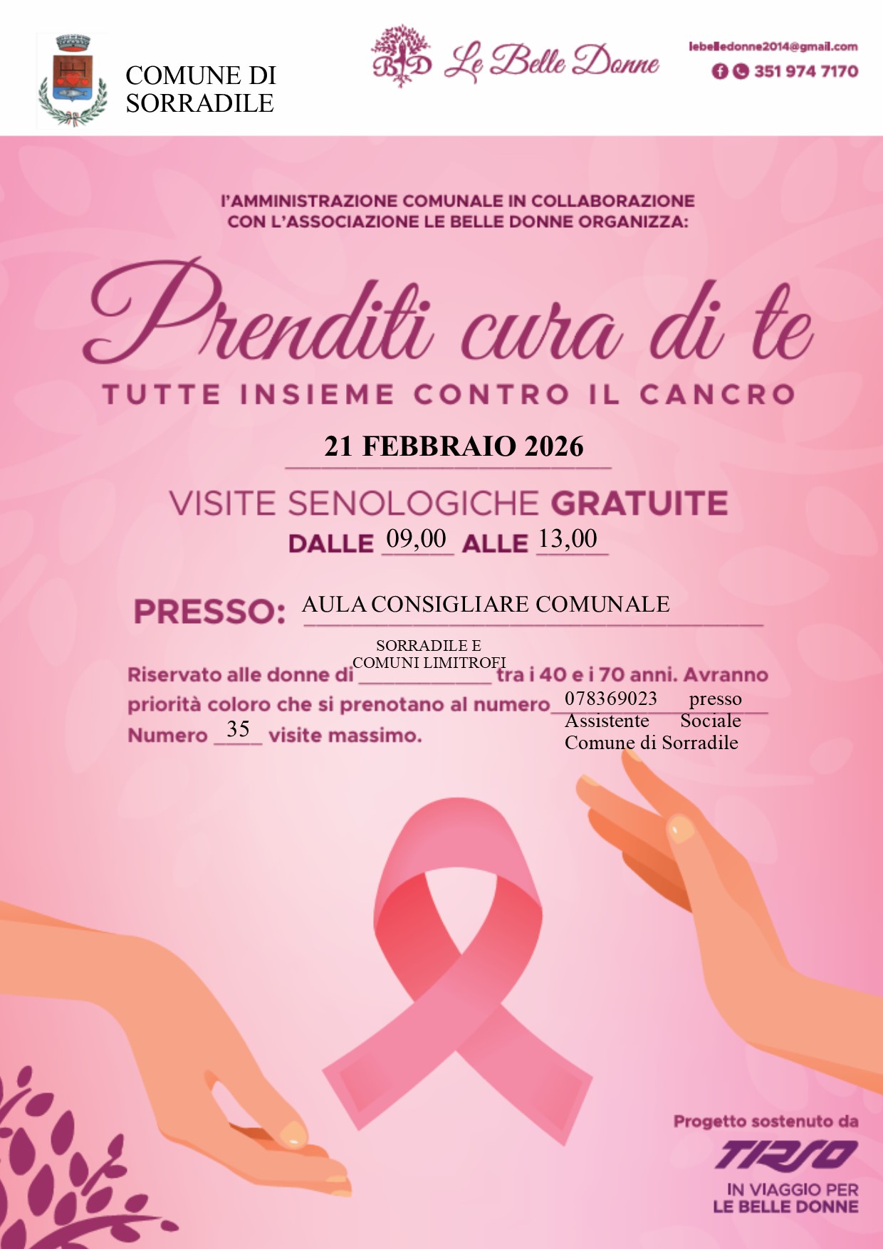 Lo screening è riservato alle donne in un'età compresa tra i 40 e i 70 anni, avranno priorità le donne residenti nel comune di Sorradile. Le persone interessate dovranno prenotarsi presso l'ufficio servi sociali