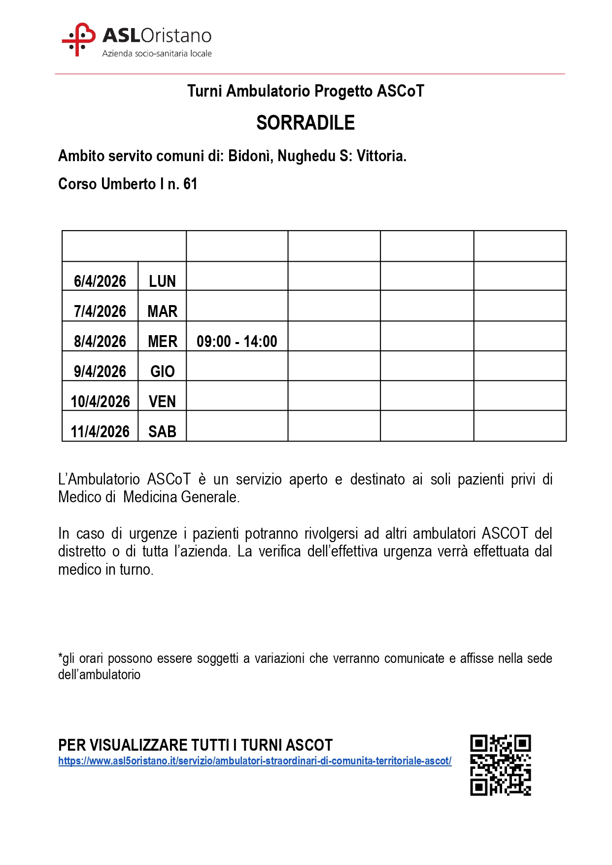 Si comunica che l'ambulatorio ASCOT del Comune di Sorradile, nella settimana dal 6 all'11 Aprile 2026, sarà aperto mercoledì 8 Aprile dalle 09.00 alle 14.00;